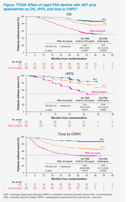 A post hoc analysis of patient-reported outcomes from TITAN showed that patients treated with apalutamide who, like our patient, achieved a rapid and deep PSA decline (≥90 percent decline or PSA ≤0.2 ng/mL) at 3 months had prolonged preservation of health-related QoL (as per total Functional Assessment of Cancer Therapy-Prostate [FACT-P]) and physical well-being, as well as less pain and fatigue compared with those who did not.5 Furthermore, rapid achievement of PSA decline to an ultra-low level (ie, >0.02–≤0.2 ng/mL within 3 months, like our patient’s) is associated with improved OS (HR, 0.46; 95 percent CI, 0.31–0.67; p<0.0001), radiographic progression-free survival (HR, 0.54; 95 percent CI, 0.35–0.83; p=0.0047), and time to castration resistance (HR, 0.51; 95 percent CI, 0.39–0.80; p=0.0015).6 (Figure)