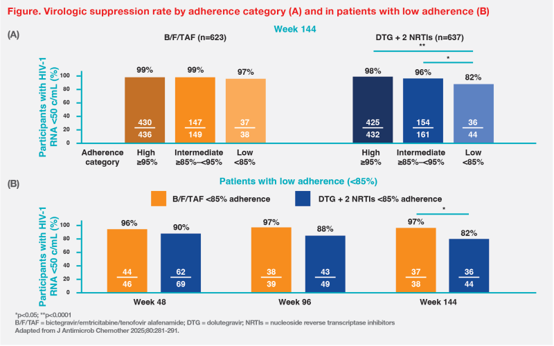 In a pooled retrospective analysis of five phase III trials, virologic suppression rate (HIV-1 RNA <50 copies/mL) remained high across all adherence groups for participants on B/F/TAF. However, patients with low adherence to DTG + two NRTIs had significantly lower virologic suppression vs those with intermediate (p=0.002) or high adherence (p<0.0001) at week 144. Among patients with low adherence (<85 percent), virologic suppression rate was higher with B/F/TAF vs DTG + two NRTIs (96 vs 90 percent) at week 48. The pattern persisted and became clinically significant at week 144 (97 vs 82 percent; p<0.05). (Figure)