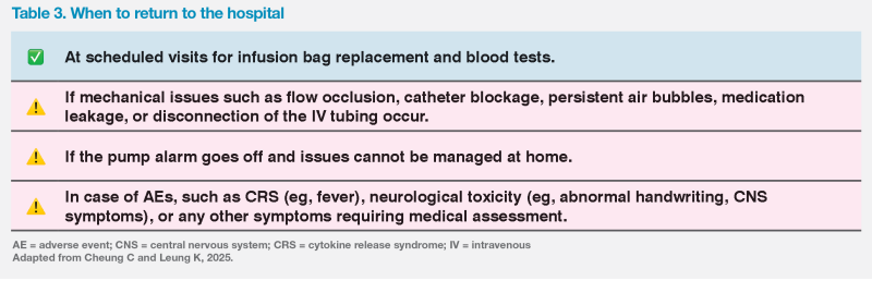 “Firstly, we identify patients suitable for home infusion. They should be fit adults with good performance status, supportÂive caregivers, and a strong motivation for home infusion,” noted Cheung. “GeneralÂly, we select stable patients with a low risk of developing cytokine release syndrome [CRS]. These patients should live close to the hospital or be able to reach it quickly in case of emergency. Patients and their caregivers need a basic understanding of how to manage outpatient infusion and the ability to operate and care for the pump after education. Motivation and willÂingness are key.”