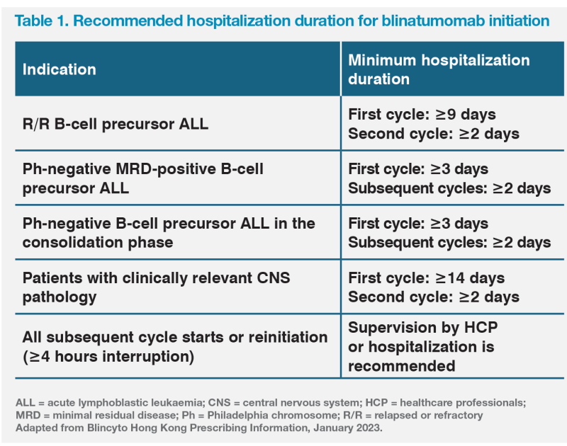 “In adult patients, hospitalization for ≥9 days during the first cycle is recomÂmended for R/R ALL. In other settings, shorter durations are often sufficient,” said Cheung. (Table 1) “The initial hospital stay is crucial, even when outpatient treatÂment is planned, as it allows close moniÂtoring of adverse events [AEs], especially during the initial phase of the first cycle, when conditions like CRS or neurologiÂcal toxicity are most likely to occur,” she explained. “To ensure safety, we usually keep patients in-hospital for close moniÂtoring during this period.”