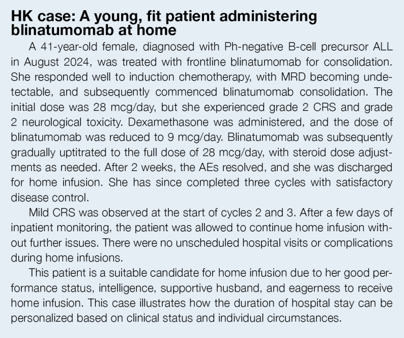 “In our hospital, approximately 60–70 percent of blinatumomab infusion cases are managed as outpatients. Over the past 2 years, >20 cycles have been sucÂcessfully administered in outpatient setÂting. Few minor issues were encountered, mainly air bubbles or tubing problems, which were promptly resolved by trained nursing staff. During this period, only one patient sought medical attention for fever during home infusion,” shared Cheung.