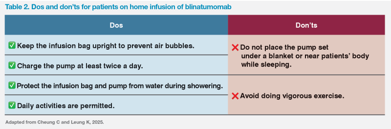 “When a patient’s condition is staÂble, treatment can be continued at home using a small, portable IV infusion pump and an admixed infusion bag containing blinatumomab, reconstituted by a pharÂmacist in aseptic conditions,” Leung and Cheung explained. “Infusion bags are available for 7-day [1-week] infusion, as well as 1-day [24-hour], 2-day [48-hour], 3-day [72-hour] and 4-day [96-hour] infusions.”