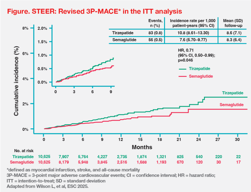 Using the US Komodo Research Database, patients aged ≥45 years with pre-existing ASCVD and overweight or obesity (body mass index [BMI] ≥27 kg/ m2), but no history of diabetes, were identified. Patients who initiated semaglutide 2.4 mg or tirzepatide on or after 13 May 2022 were matched 1:1 using a propensity score model and followed up until 31 January 2025. The real-world STEER study population resembled the SELECT trial’s population. [Wilson L, et al, ESC 2025; N Engl J Med 2023;389: 2221-2232]