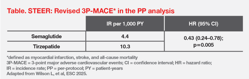 Of note, semaglutide 2.4 mg was associated with a 57 percent reduction in risk of revised 3P-MACE vs tirzepatide in the PP analysis. (Table)