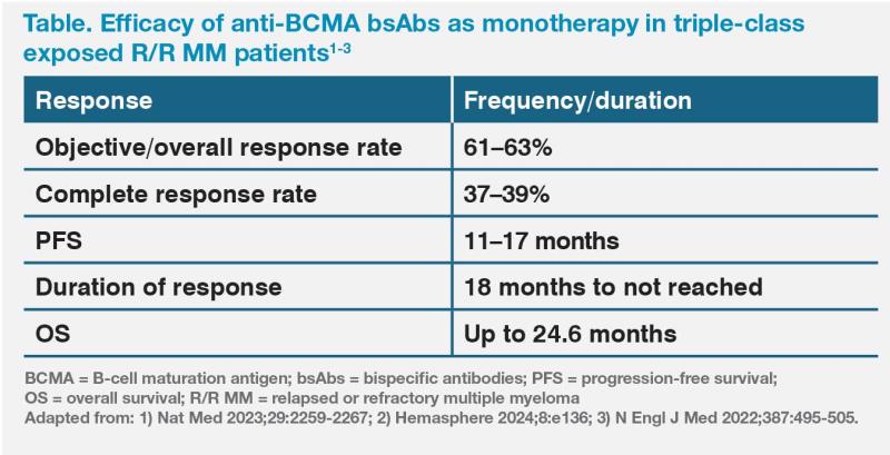 Anti-BCMA bsAbs have established a key role in the new treatment era as monotherapy for triple-class exposed R/R MM patients who have received ≥3 prior therapies, including an IMiD, a PI, and an anti-CD38 mAb, and have experienced disease progression on their last treatment. Durable responses and survival benefits have been shown in these heavily pretreated patients, with duration of response not reached and an overall survival of 2 years. (Table) [Elranatamab Hong Kong Prescribing Information; NCCN Clinical Practice Guidelines in Oncology, Multiple Myeloma, version 2.2026; Antibodies (Basel) 2023;12:38; Hemasphere 2024;8:e136]