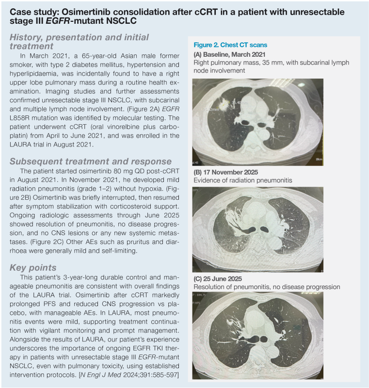 A representative case from LAURA — a 65-year-old male with unresectable stage III EGFR-mutant NSCLC — highlights the durable long-term control and manageable toxicity associated with osimertinib consolidation after cCRT. (Case study)