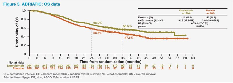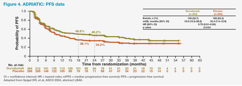 Durvalumab consolidation significantly extended OS for more than 22 months. mOS with durvalumab vs placebo was 55.9 vs 33.4 months (HR, 0.73; 95 percent CI, 0.57–0.93; p=0.0104). (Figure 3) Similarly, PFS was markedly improved with durvalumab, with mPFS of 16.6 vs 9.2 months with placebo (HR, 0.76; 95 percent CI, 0.61–0.95; p=0.0161). (Figure 4) [Spigel DR, et al, ASCO 2024, abstract LBA5]