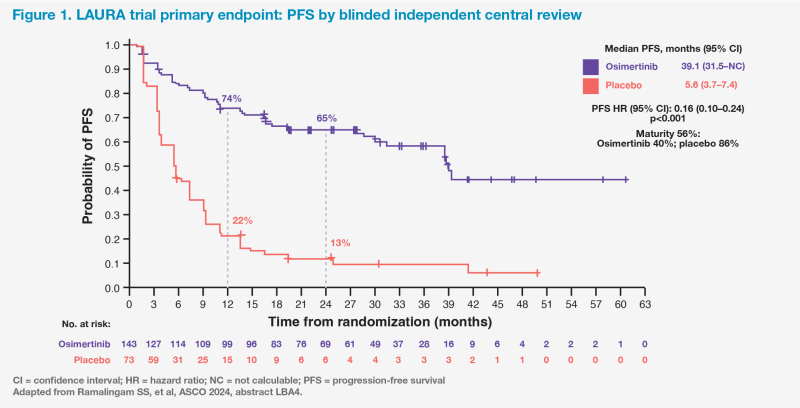 Osimertinib demonstrated a significant PFS benefit vs placebo, with mPFS of 39.1 vs 5.6 months, representing an 84 percent reduction in risk of progression or death (HR, 0.16; 95 percent CI, 0.10–0.24; p<0.001). (Figure 1)