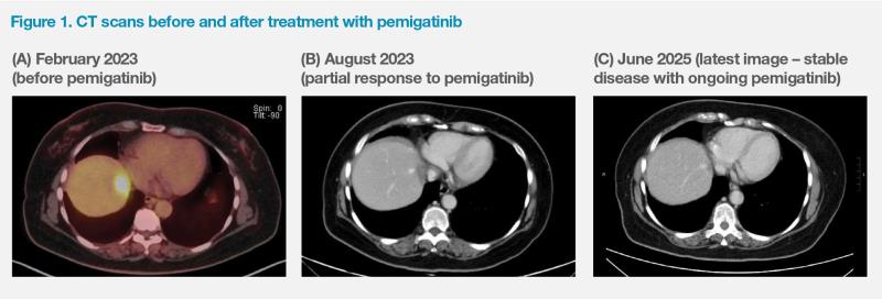 Beyond clinical trials, a recent US study demonstrated pemigatinib’s efficacy in the real-world setting, reporting a real-world PFS of 7.4 months and a real-world ORR of 59.2 percent in cholangiocarcinoma patients – exceeding values reported in FIGHT-202.2 These findings contradict conventional expectations, as real-world effectiveness is typically lower than in clinical trials, where patient selection is more stringent.5 Our patient’s remarkable 26 months of PFS further illustrates the robust efficacy of pemigatinib in the real-world setting, highlighting the potential for selected patients with FGFR2 fusions to achieve prolonged disease control.2,4