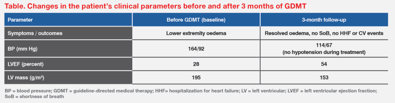 After 3 months of treatment, the patient demonstrated significant clinical improvement. Her oedema had completely resolved with no recurrence. With no SoB noted, she was encouraged to increase physical activity. Echocardiography showed a remarkable increase in LVEF to a near-normal level of 54 percent, with an LV size/mass of 153 g/m². The patient tolerated GDMT well with no adverse events reported. Her BP was well controlled at 114/67 mmHg. (Table)