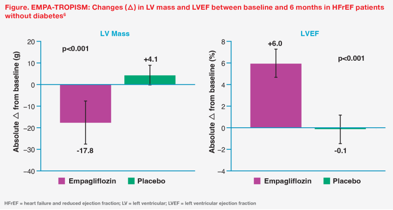 The improvement in the patient’s LVEF may be explained by empagliflozin’s potential in reversing cardiac remodelling. In the EMPA-TROPISM trial involving nondiabetic patients with HFrEF, empagliflozin reduced LV mass (-17.8 vs 4.1 g; p<0.001) and improved LVEF (+6 vs -0.1 percent; p<0.001) vs placebo by month 6, as determined by cardiac magnetic resonance. These findings indicate a beneficial effect on LV remodelling.6 (Figure)