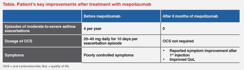After the first dose of mepolizumab, the patient reported immediate symptom improvement. She was then discharged from hospital with monthly subcutaneous (SC) mepolizumab injection pens. Her frequency of clinic visits decreased from twice monthly to once every 2–3 months. Notably, the frequency of moderate-to-severe exacerbations decreased from four episodes per year to zero. (Table)