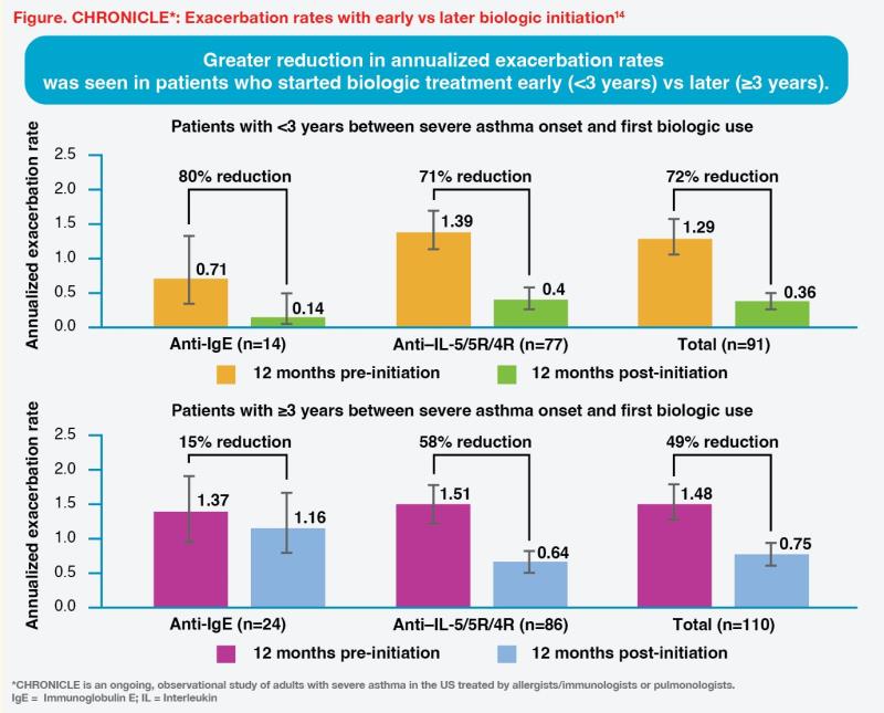 Early use of biologics not only reduces exacerbations, but also helps preserve lung health.14,15 In the real-world observational CHRONICLE study in US adults with severe asthma, initiating biologics <3 years from severe asthma onset led to numerically greater reductions in annualized exacerbations (72 vs 49 percent) than starting after ≥3 years.14 (Figure)