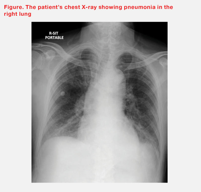 Chest X-ray revealed signs of heart failure (HF) as well as pneumonia in the right lower and right upper zones of the patient’s lungs. (Figure) Respiratory sample tested positive for respiratory syncytial virus (RSV) on polymerase chain reaction assay. The suspected superimposed bacterial infection causing pneumonia was managed with antibiotics.
