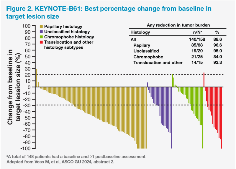 “Deep tumour responses were re­ported across the different histological subtypes,” said Grünwald. The overall reduction in tumour burden was 88.6 percent, and rates in the papillary, unclas­sified, chromophobe, and translocation/ other subgroups were 96.6, 95.0, 84.0, and 93.3 percent, respectively. (Figure 2) [Voss M, et al, ASCO GU 2024, abstract 2]
