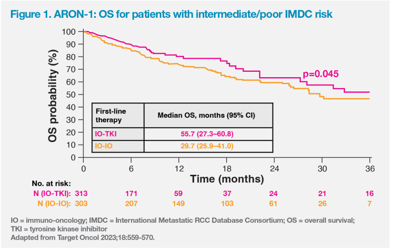 Among the 616 patients with in­termediate/poor IMDC risk, median OS was significantly longer with IO-TKI compared with dual IO therapy (55.7 vs 29.7 months; p=0.045). (Figure 1) [Target Oncol 2023;18:559-570]. Although this observation is of interest, retrospective analyses remain prone to known and un­known confounders, which impact out­come data and render medical interpreta­tion of such comparisons complex.