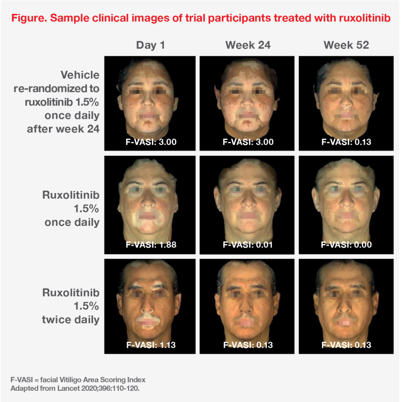 In a randomized, double-blind, phase II study, ruxolitinib monotherapy demonstrated effective and sustained repigmentation in adults (n=157) with vitiligo. A significantly higher proportion of patients who applied 1.5 percent ruxolitinib cream QD or BID had a ≥50 percent improvement from baseline in facial Vitiligo Area Scoring Index (F-VASI) score at week 24 vs vehicle (QD: 50 vs 3 percent; odds ratio [OR], 28.5; 95 percent confidence interval [CI], 3.7–1,305.2; p<0.0001) (BID: 45 vs 3 percent; OR, 24.7; 95 percent CI, 3.3–1,121.4; p=0.0001). Continuous improvement was seen through 52 weeks of therapy. (Figure) [Lancet 2020;396:110-120]