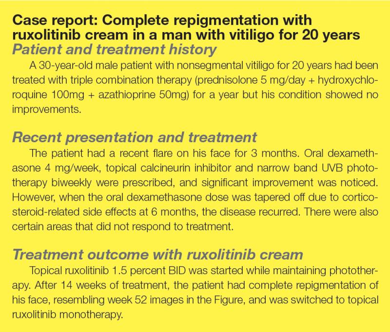 Ruxolitinib, a topical inhibitor of JAK 1 and 2, is indicated for treatment of nonsegmental vitiligo with facial involvement in patients ≥12 years of age. It is the first and only US FDA—approved treatment for skin repigmentation in vitiligo. [Lumirix Hong Kong Prescribing Information; https://www.fda.gov/ drugs/news-events-human-drugs/ fda-approves-topical-treatment-addressing-repigmentation-vitiligo-patients-aged-12-and-older] Of note, monobenzone, the other US FDA– approved topical treatment for vitiligo, permanently depigments normal skin surrounding vitiliginous lesions. [https:/www.accessdata.fda.gov\/drugsatfda_docs/label/2003/08173slr015_benoquin_lbl.pdf]