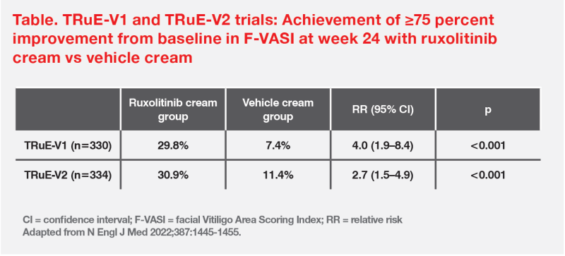 Two phase III, randomized controlled trials of ruxolitinib cream (TRuE-V1 [n=330] and TRuE-V2 [n=334]) in patients ≥12 years of age with nonsegmental vitiligo confirmed the results of the phase II study. In TRuE-V1, a significantly higher proportion of patients in the ruxolitinib monotherapy vs vehicle cream group achieved ≥75 percent improvement from baseline in F-VASI at week 24 (29.8 vs 7.4 percent; relative risk [RR], 4.0; 95 percent CI, 1.9–8.4; p<0.001) vs the vehicle cream group. Similar findings were reported in TRuE-V2 (30.9 vs 11.4 percent; RR, 2.7; 95 percent CI, 1.5–4.9; p<0.001). (Table) [N Engl J Med 2022;387:1445-1455]