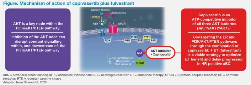 Activation of the PI3K/AKT/mTOR pathway shortens survival and leads to ET resistance in patients with ER+/ HER2- mBC, providing a strong rationale for targeting these signalling proteins. Co-targeting both the PI3K/AKT and ET pathways and capivasertib plus fulvestrant is a viable strategy to prolong benefit from ET. (Figure) [Cancer Treat Rev 2025;135:102924; Dawood S, 2025]