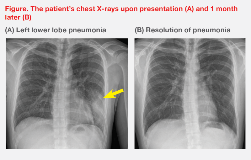 Subsequently, the patient’s respiratory symptoms and fever gradually subsided, and he did not have recurrence of chest pain. He was hospitalized for 5 days and is currently in stable condition. Chest X-ray 1 month later showed resolution of pneumonia. (Figure)