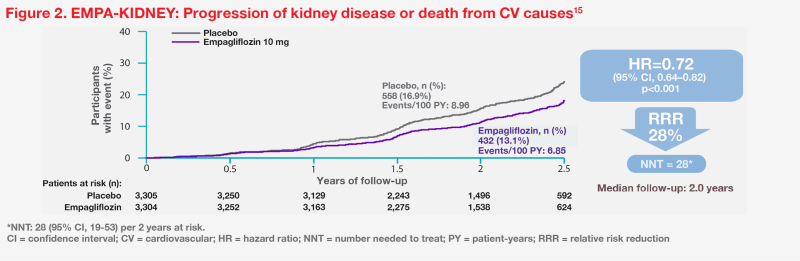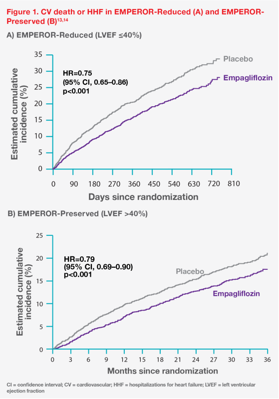 In the EMPA-REG OUTCOME trial in T2DM patients with established CV disease, empagliflozin reduced CV death (relative risk reduction [RRR], 38 percent; p<0.001), HF hospitalization (RRR, 35 percent; p=0.002), and all-cause mortality (RRR, 32 percent; p<0.001) vs placebo.12 Additionally, empagliflozin lowered CV death or HF hospitalization risk vs placebo consistently in patients with HF irrespective of LVEF, with or without diabetes, in both the EMPEROR-Reduced and EMPEROR-Preserved trials, and reduced the risk of CKD progression or CV death vs placebo in EMPA-KIDNEY.13-15 (Figures 1 and 2) Similar benefits in HF patients with reduced, preserved or mildly reduced LVEF had been found with dapagliflozin.16,17