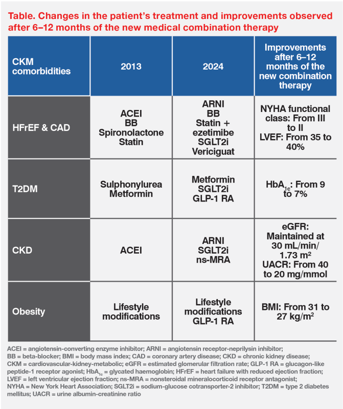The patient defaulted follow-up and revisited my clinic with worsened CKM syndrome in 2024. His HbA1c had increased to 9.0 percent, potassium level increased to 5.3 mmol/L, eGFR was reduced to 30 mL/min/1.73 m², UACR had increased to 40 mg/mmol, and his BMI had increased to 31 kg/m². His LVEF was now 35 percent. He had New York Heart Association (NYHA) functional class III symptoms, with marked limitation in his daily activities. (Table)