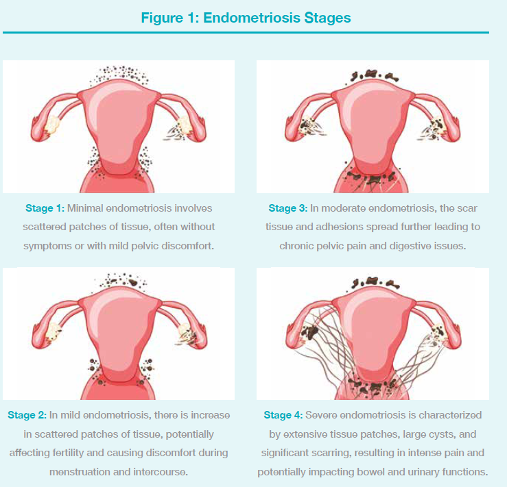 Endometriosis presents in stages with each stage a reflection of the complexity and varied impact of the disease (Figure 1). From minimal to severe, each stage indicates the condition’s progression, providing insights into the symptoms and treatment options designed to alleviate pain and restore quality of life.