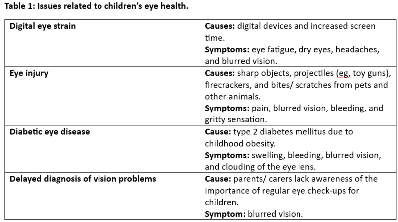 Apart from the increased myopia rates, other issues related to children’s eye health include digital eye strain, eye injury, childhood obesity, and lack of awareness. (Table 1)