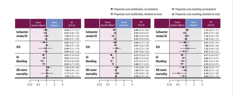 At its conclusion, the study was able to review longitudinal health records of over half a million patients and it clearly showed that apixaban has a significantly lower risk of GI bleeding compared to dabigatran, edoxaban and rivaroxaban. Similar risk was noted across the different DOACs for the composite of stroke and systemic embolism, and intracranial hemorrhage, and all-cause mortality (Figure 1).
