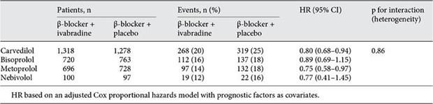 Table 2. Effect of beta-blockers in combination with ivabradine vs. beta-blockers in combination with placebo on the composite endpoint of cardiovascular death or hospitalization for worsening heart failure in patients receiving different beta-blockers.