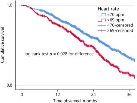 Figure 2. Kaplan-Meier plot of survival of patients with an LVEF <40% from the time of stable follow-up when attending specialized outpatient HF hospital clinics. n = 1,814 for HR <70 bpm and n = 875 for HR ≥70 bpm.