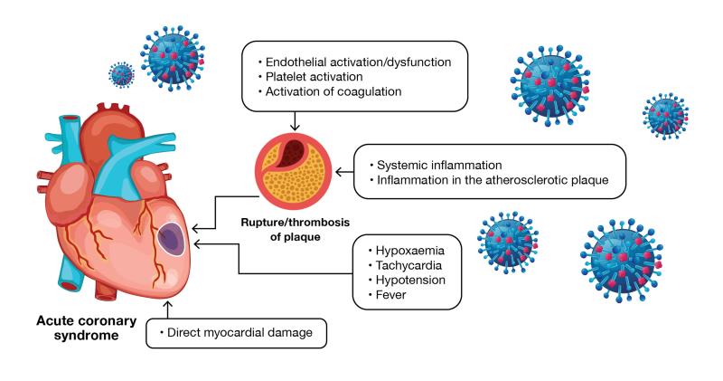 The pathophysiology behind the link between acute MI and influenza rests on the release of inflammation cytokine and rupture of atherosclerotic plaque, triggering prothrombotic events leading to coronary artery occlusion. [Eur Heart J Suppl 2020;22(Suppl E):E68-E72]