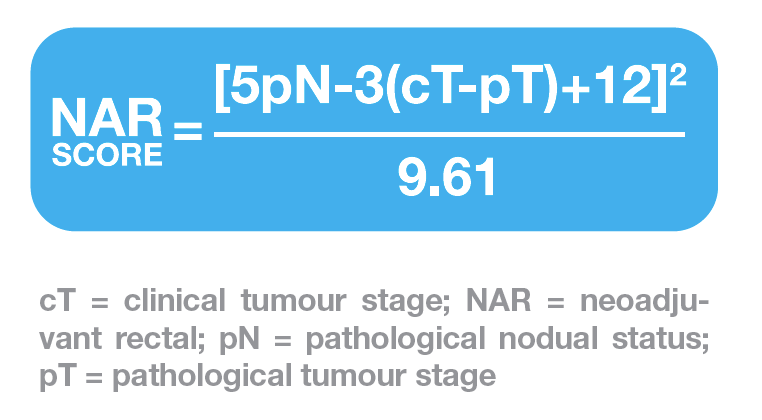 NAR score is a composite endpoint calculated based on the changes in clinical and pathological tumour stages, plus nodal status after neoadjuvant CRT, resulting in 24 possible discrete scores ranging from 0 to 100. Lower NAR scores represent better prognosis. [Curr Colorectal Cancer Rep 2015;11:275-280; Lancet Oncol 2021;22:e314-e326]