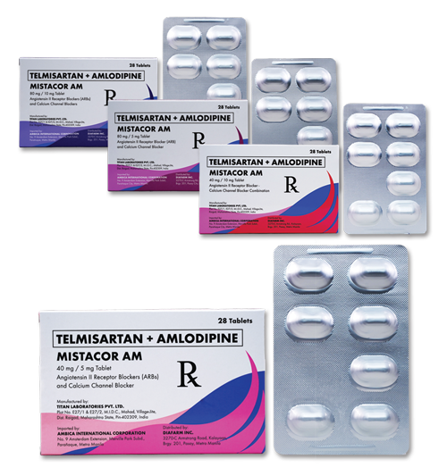 • Telmisartan + Amlodipine besilate (Mistacor AM) combines two antihypertensive compounds with complementary mechanisms to control blood pressure in patients with essential hypertension: an angiotensin II receptor antagonist, telmisartan, and a dihydropyridinic calcium channel blocker, amlodipine.