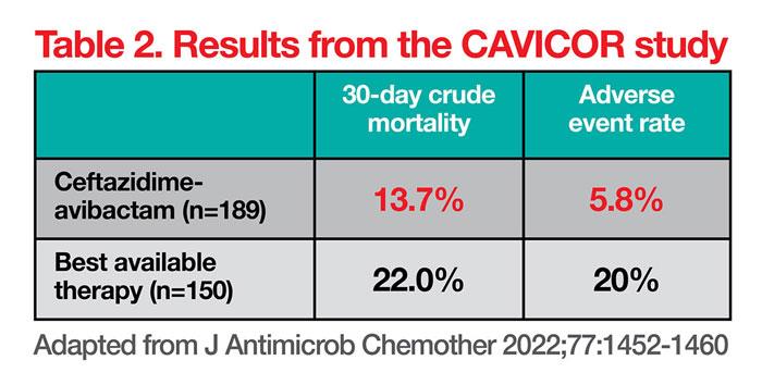 In the CAVICOR study which was the largest comparative series of real-world data of patients with CPE infections treated with ceftazidime-avibactam or BAT, ceftazidime-avibactam had a lower 30-day mortality compared with BAT (Table 2). [J Antimicrob Chemother 2022;77:1452-1460]